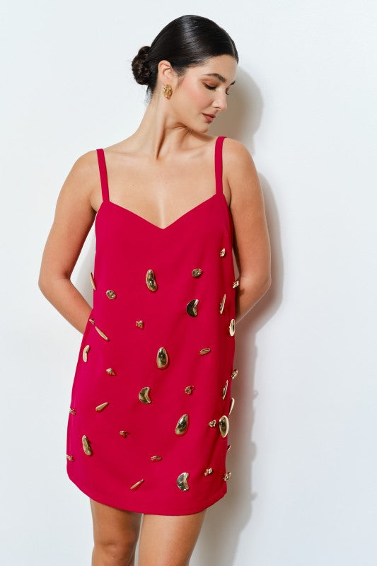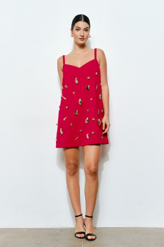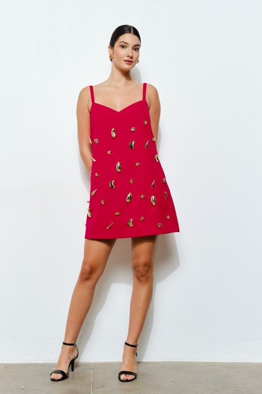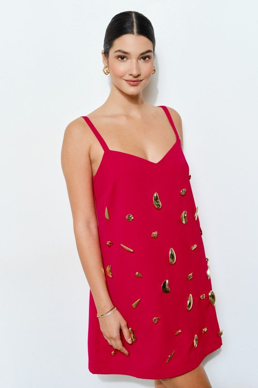 -Scattered metallic embellishments add a bold, sculptural effect