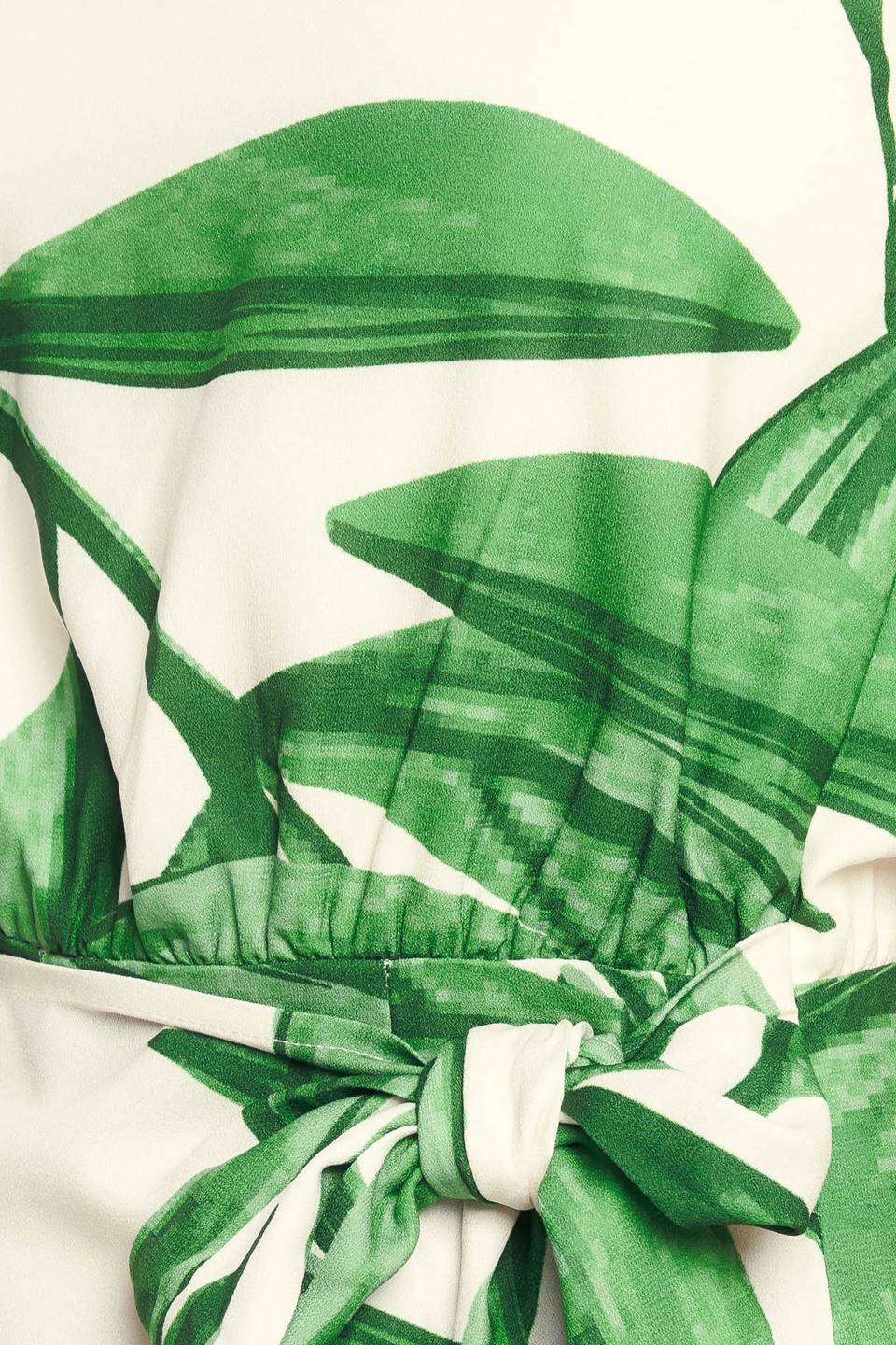 A printed woven skort romper featuring one shoulder, skort bottom with side tie and side zipper closure