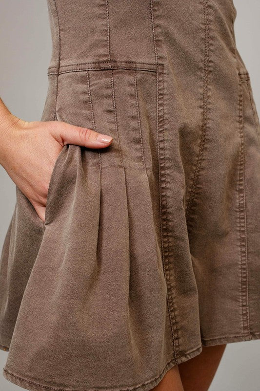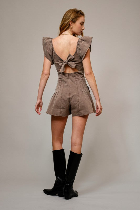 Stretch denim romper featuring a sweetheart neckline, ruffle sleeves, pleated hip details, and a tie-back design.