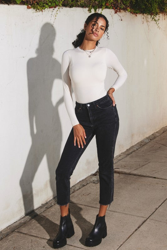 Long sleeve bodysuit with a high crew neckline.